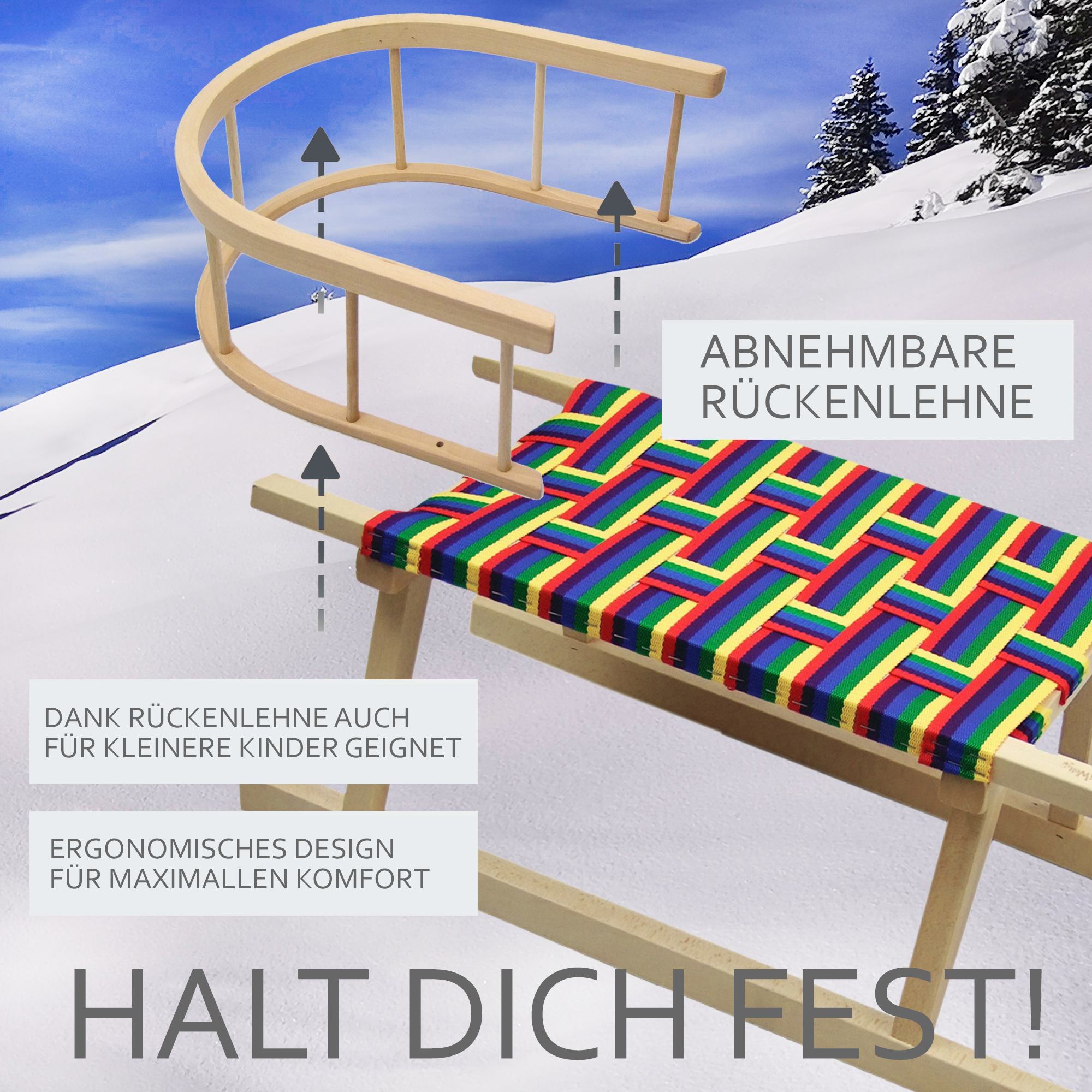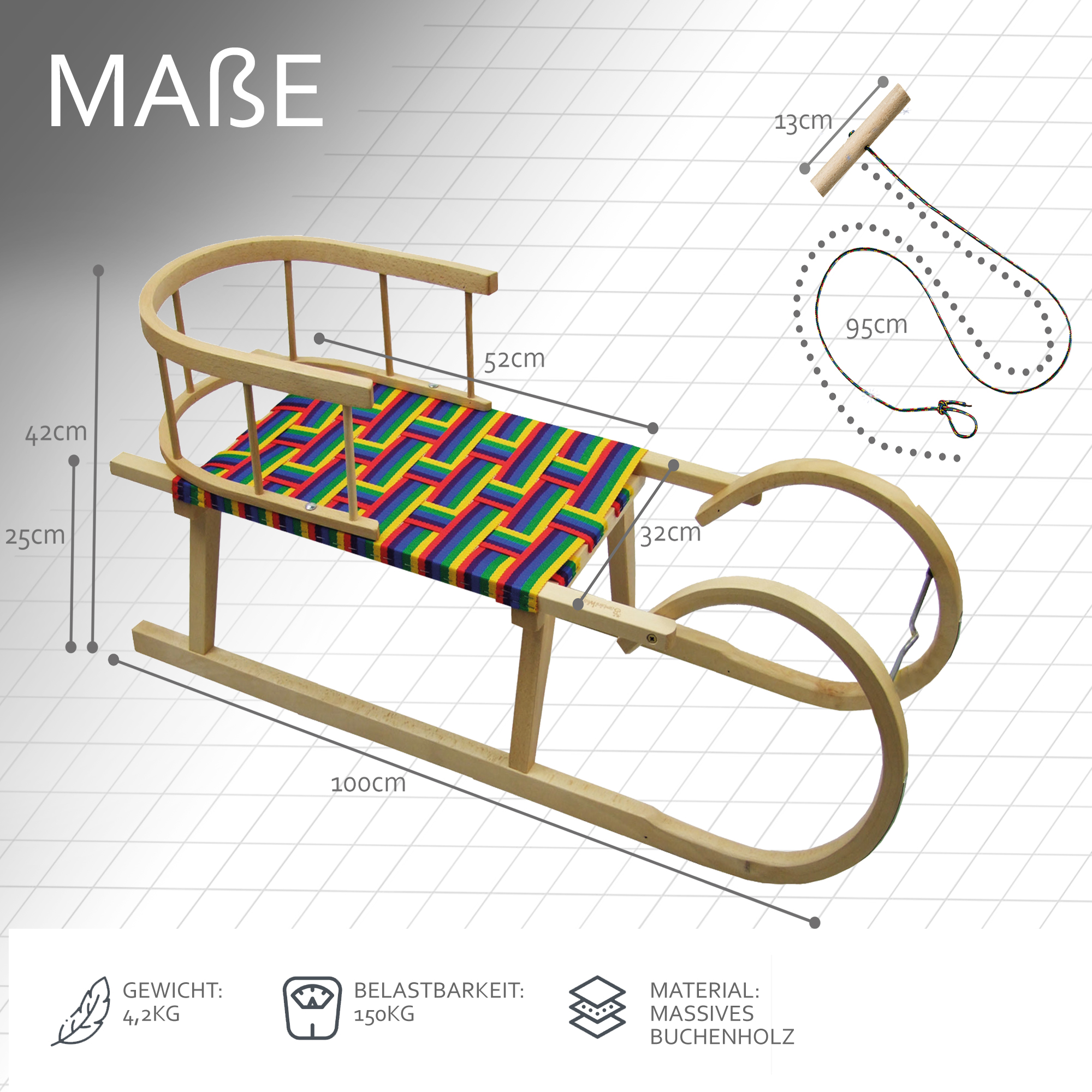 BAMBINIWELT Holzschlitten/Hörnerrodel 100cm mit Rückenlehne, Sitzfläche aus strapazierfähigen Kunstfasern im Regenbogendesign