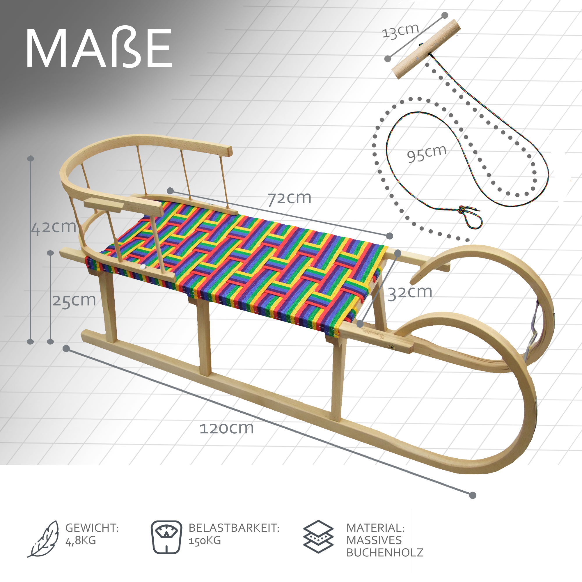 BAMBINIWELT Holzschlitten/Hörnerrodel 120cm mit Rückenlehne, Sitzfläche aus strapazierfähigen Kunstfasern im Regenbogendesign