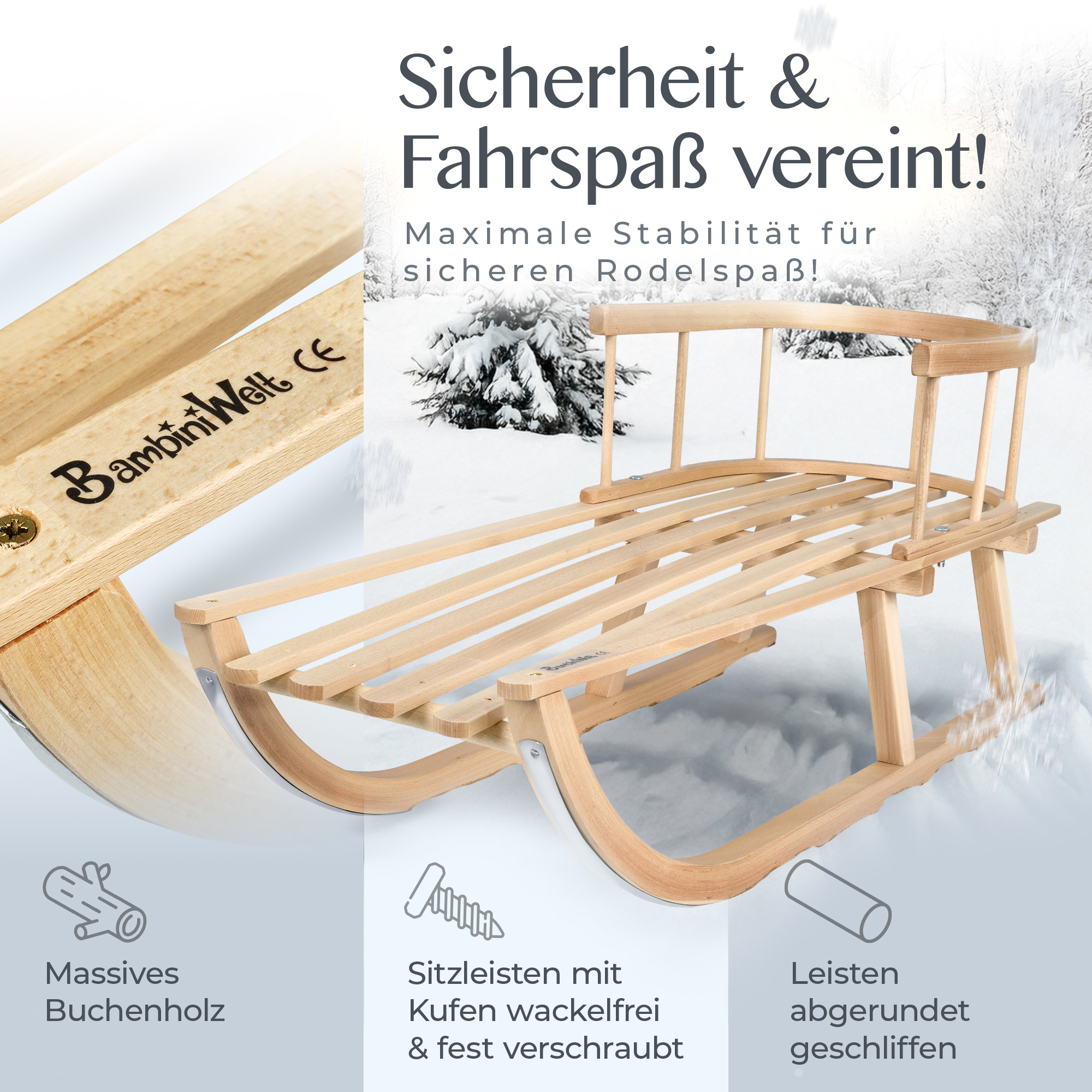 BAMBINIWELT Holzschlitten mit Zugseil und Rückenlehne, Buchenholz naturlackiert, Metallkufen, 90cm