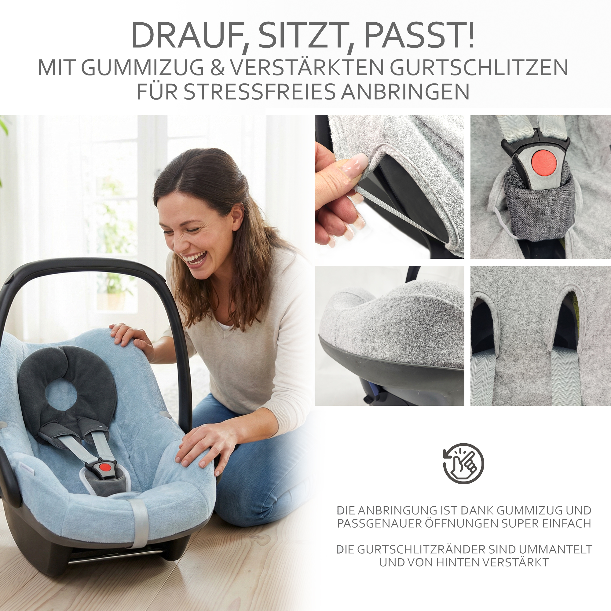 Gurtlöcher und Schlitze sind ummantelt und von hinten extra verstärkt. Problemlos waschbar bei 30 Grad.