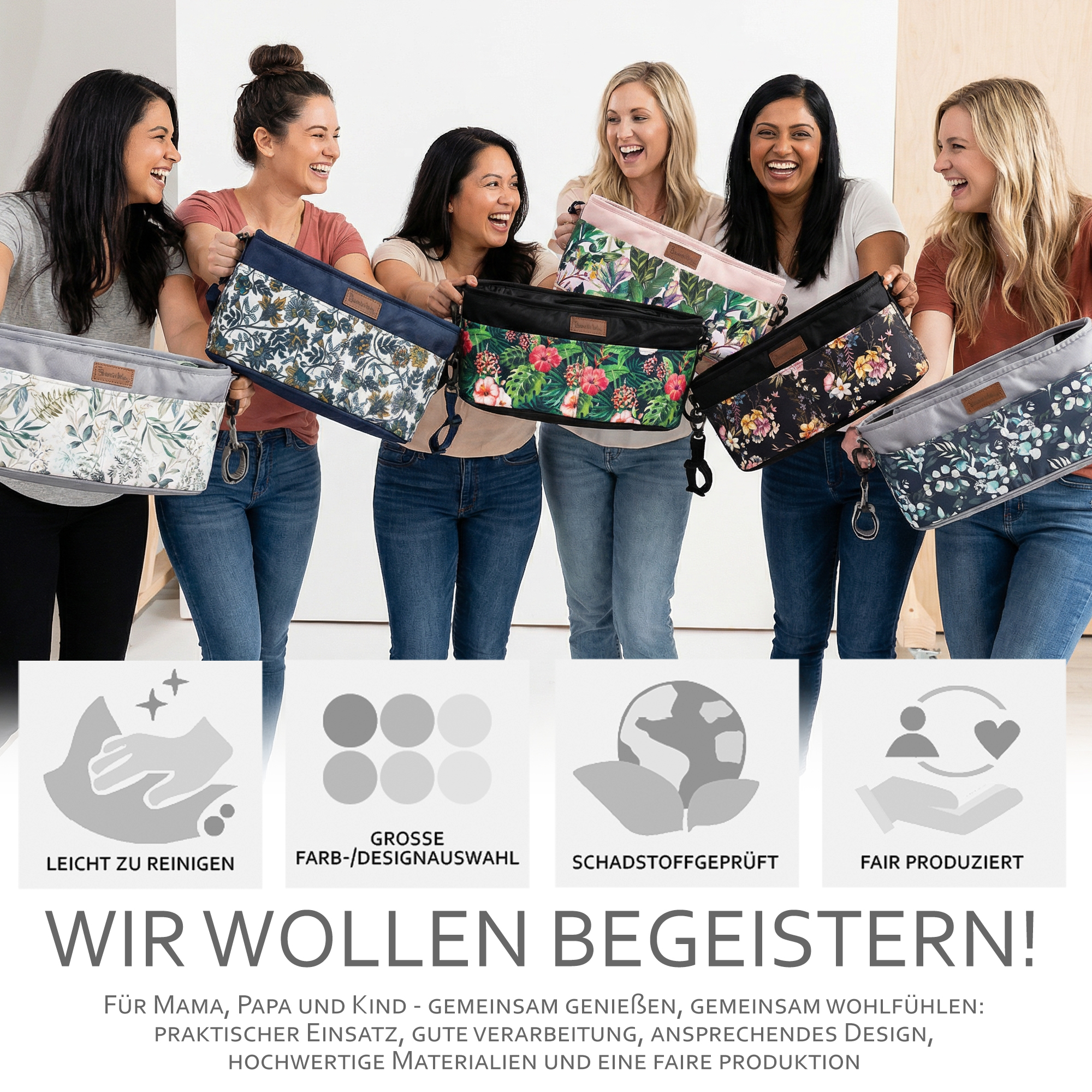 Der Kinderwagenorganizer gibt´s in vielen trendigem Designs - wasserabweisend, formstabil und pflegeleicht und die leichte Alternative zur großen Wickeltasche. Praktisches Zubehör für Sportwagen, Jogger, Kinderwagen oder Fahrradanhänger und somit einfach ideal für Ausflüge, Urlaub und tägliche Erledigungen.